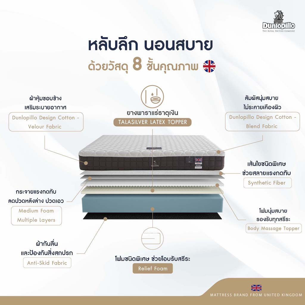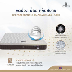 - Talasilver Latex Topper ยางพาราที่มีคุณสมบัติโครงสร้างเซลล์แบบเปิด (Opened Cell) ระบายอากาศได้ในตัว ช่วยสร้างความรู้สึกผ่อนคลายและมีส่วนช่วยให้อากาศไหลเวียนได้อย่างอิสระ ไม่ทำให้เกิดอาการแพ้ เหมาะสำหรับบุคคลที่เป็นโรคภูมิแพ้ นวัตกรรมนำเข้าจากประเทศอังกฤษ