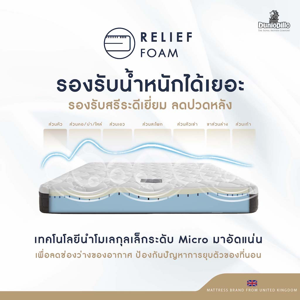 - Relief Foam ฐานโฟมคุณภาพสูงที่ผ่านการอัดแน่นด้วยเทคโนโลยี Micro Compression โดยการนำโมเลกุลเล็กๆ ระดับ Micro มาอัดแน่นเพื่อลดช่องว่างของอากาศ ป้องกันปัญหาการยุบตัวของที่นอนและ สามารถรองรับน้ำหนักได้อย่างมีประสิทธิภาพ มาพร้อมระบบระบายอากาศภายในตัว สามารถถ่ายเทความร้อนจากภายในที่นอนได้อย่างสมบูรณ์แบบ