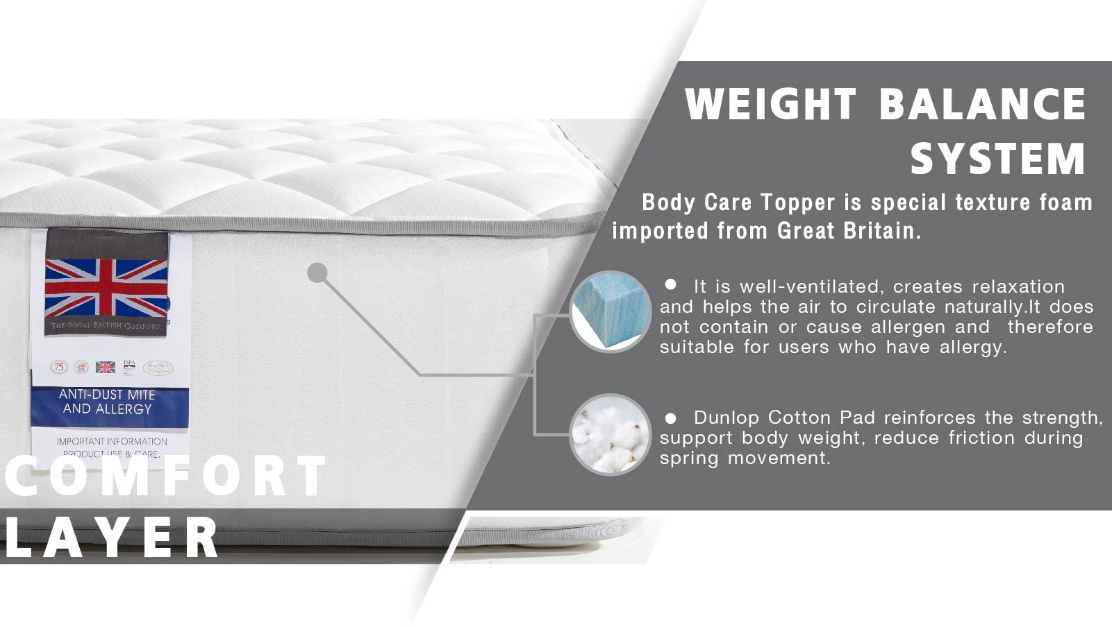 - Body Care Topper is special texture foam imported from Great Britain. It has high density and is well- ventilated. You will feel relaxed and comfortable as the air can ventilate freely. It does not contain or cause allergen and therefore suitable for users who have allergy.