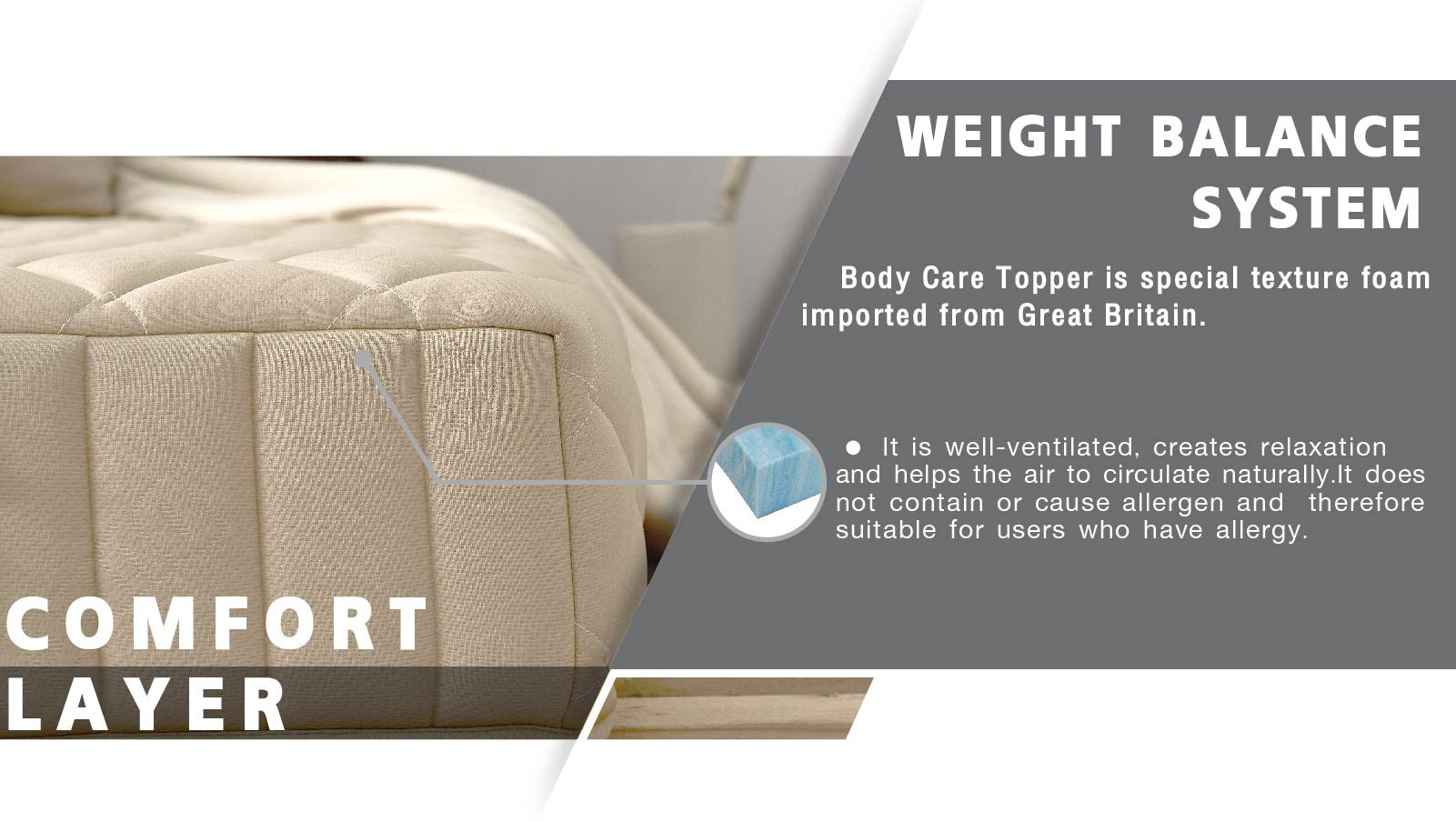 • Body Care Topper is special texture foam imported from Great Britain. It has high density and is well- ventilated. You will feel relaxed and comfortable as the air can ventilate freely. It does not contain or cause allergen and therefore suitable for users who have allergy.