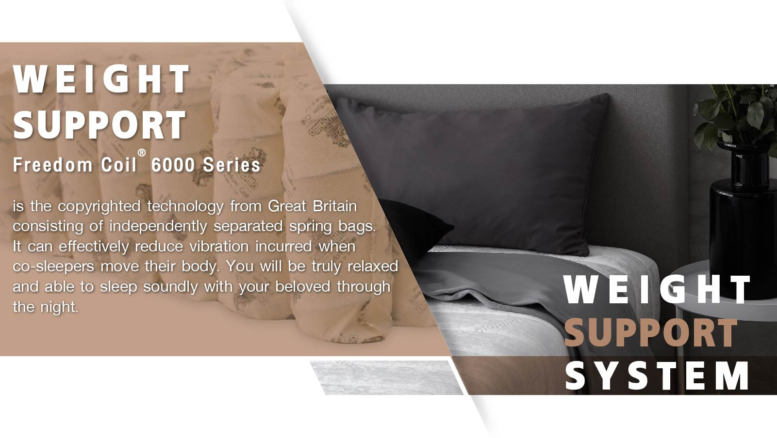 Freedom Coil Pocket Spring 6000 – Series ® is the copyrighted technology from Great Britain consisting of independently separated spring bags. It can effectively reduce vibration incurred when co-sleepers move their body. You will be truly relaxed and able to sleep soundly with your beloved through the night.