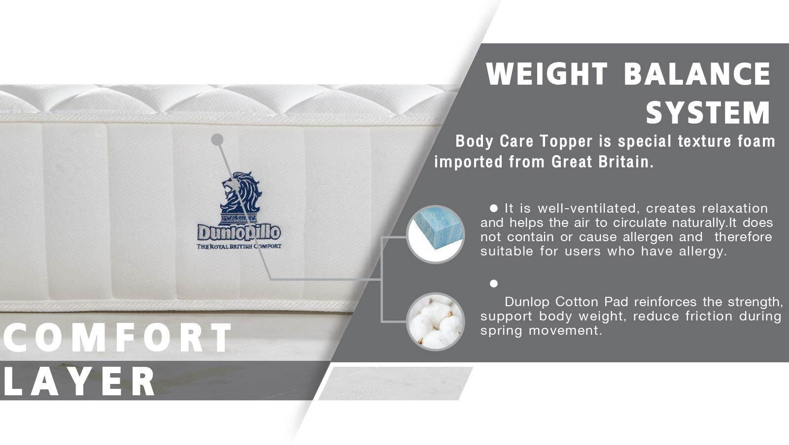 Body Care Topper is special texture foam imported from Great Britain. It has high density and is well- ventilated. You will feel relaxed and comfortable as the air can ventilate freely. It does not contain or cause allergen and therefore suitable for users who have allergy.