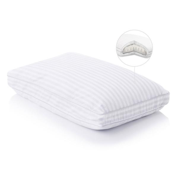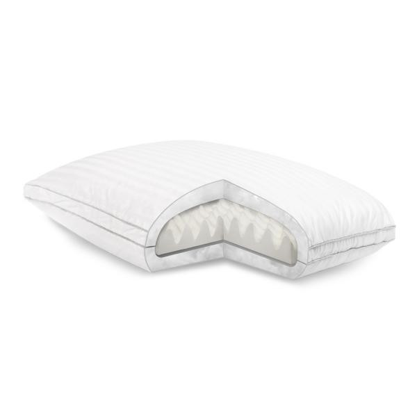 The Convolution® is crafted with the multi-position sleeper in mind and offers different levels of customizable support. A convoluted memory foam core encased in airy Gelled Microfiber® fill creates a soft, supportive sleeping surface, while the other side offers more support for side sleeping. Remove the core for an ultra-plush, luxurious down feel without odors, allergens, and sharp quills. A 300 thread count damask striped cover encases this pillow for added comfort. Cover: 100% cotton, Fill: 50% siliconized polyester fiber, 50% polyurethane foam