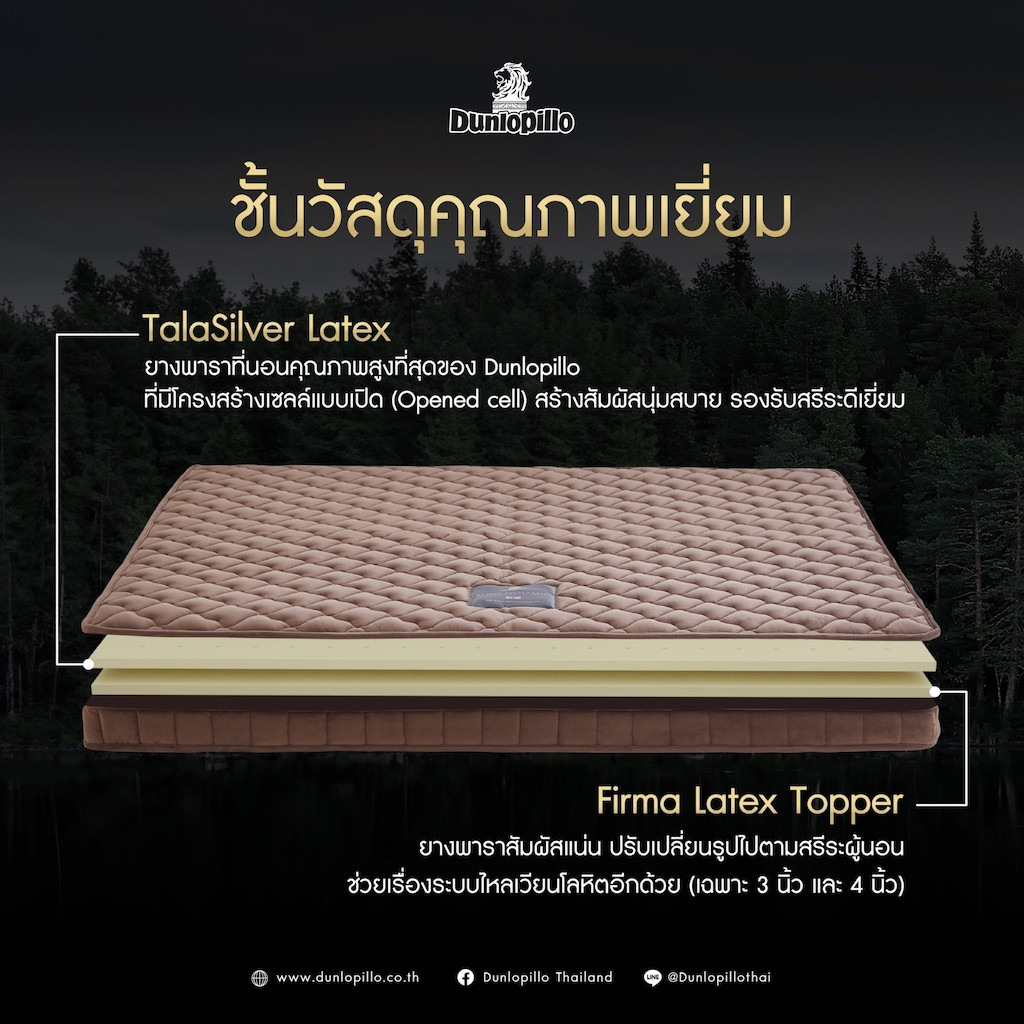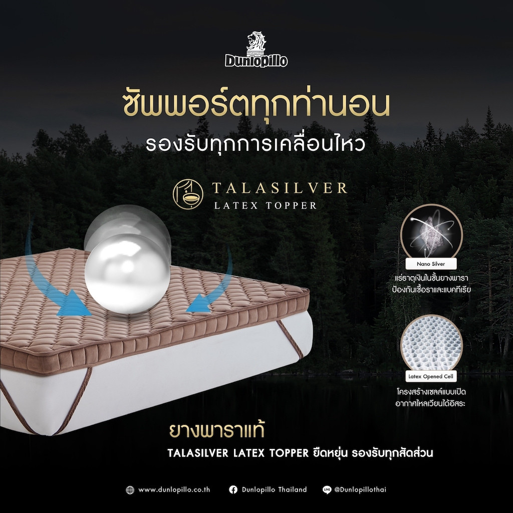 • TalaSilver Latex ยางพาราที่มีคุณสมบัติโครงสร้างเซลล์แบบเปิด (Opened Cell) ระบายอากาศได้ในตัว ช่วยสร้างความรู้สึกผ่อนคลาย และมีส่วนช่วยให้อากาศไหลเวียนได้อย่างอิสระ ไม่ทำให้เกิดอาการแพ้ เหมาะสำหรับบุคคลที่เป็นโรคภูมิแพ้ นำเข้าจากประเทศอังกฤษ