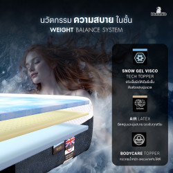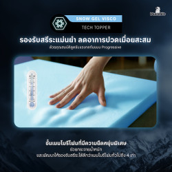 - Snow Gel Visco Tech Topper อนุภาคเจลที่มีโครงสร้างเป็นน้ำและสารสกัดจากธรรมชาติ ทำให้กักเก็บความเย็นได้ดีเป็นพิเศษ ดูดซับความร้อน หมดปัญหาความอับชื้น โดยผสานเข้ากับชั้นรองรับ Visco Tech นวัตกรรมที่ได้รับการพัฒนาให้เหนือกว่าเมมโมรีโฟมทั่วไปด้วยคุณสมบัติการดูดซับแรงกดทับได้แบบ Progressive มีคุณสมบัติระบายอากาศและการรองรับน้ำหนักที่มีประสิทธิภาพมากกว่าเมมโมรีโฟมถึง 4 เท่าตัว
