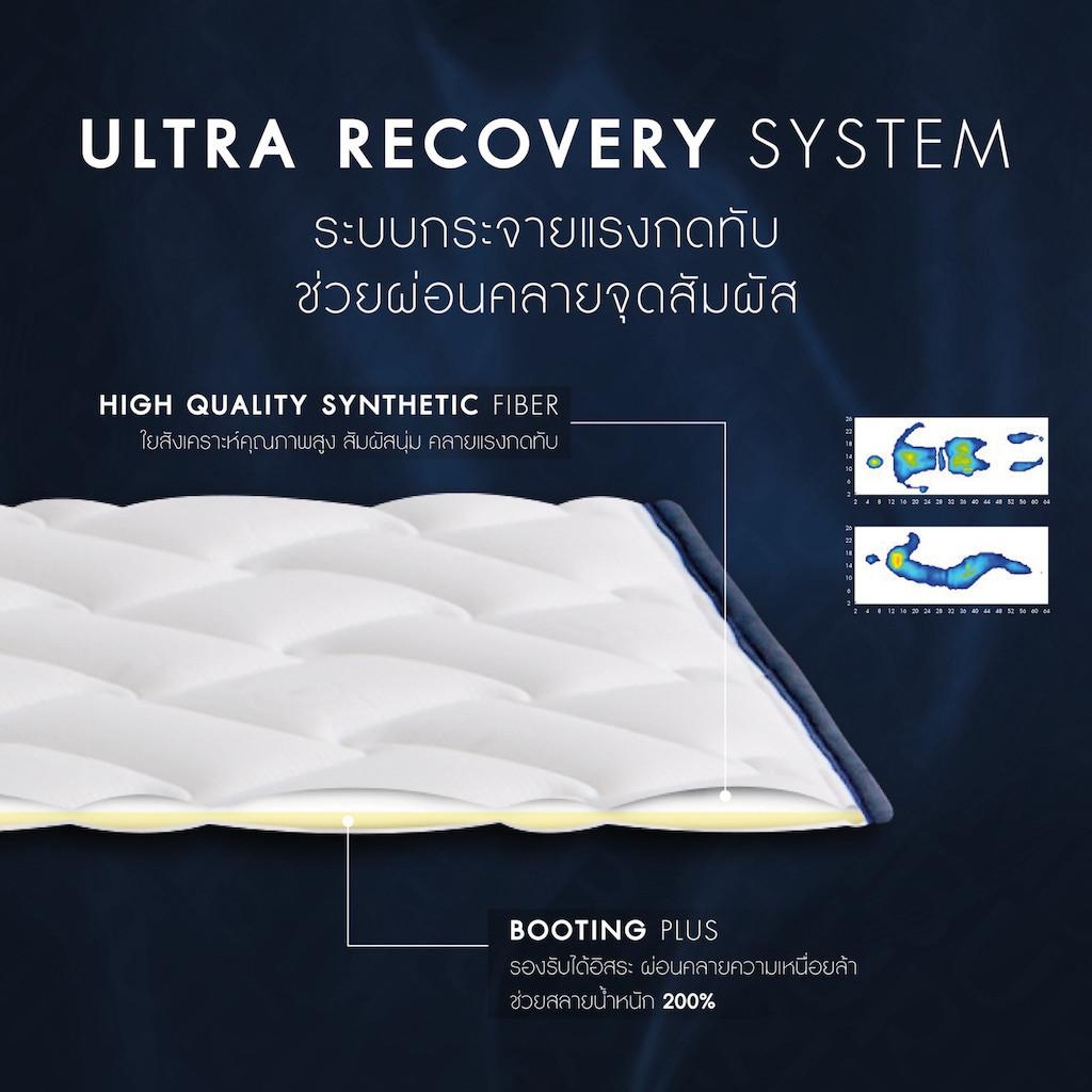 Ultra Recovery System ระบบกระจายแรงกดทับ ช่วยผ่อนคลายจุดสัมผัส ที่ผสานระหว่าง High Quality Synthetic Fiber ใยสังเคราะห์คุณภาพสูง สัมผัสนุ่ม คลายแรงกดทับ และ Boosting Tech ช่วยรองรับได้อิสระ ผ่อนคลายความเหนื่อยล้า สลายน้ำหนักได้มากกว่า 200%