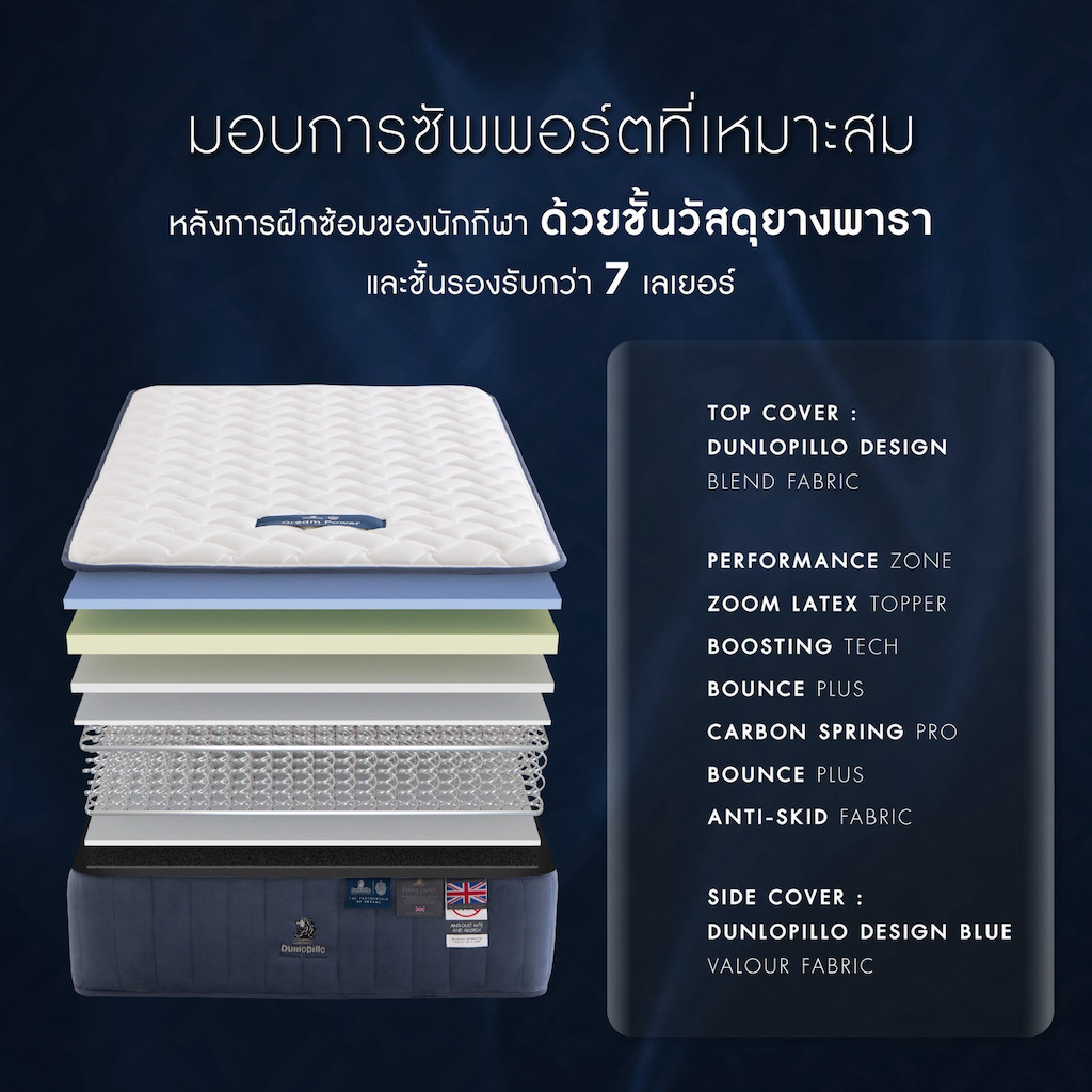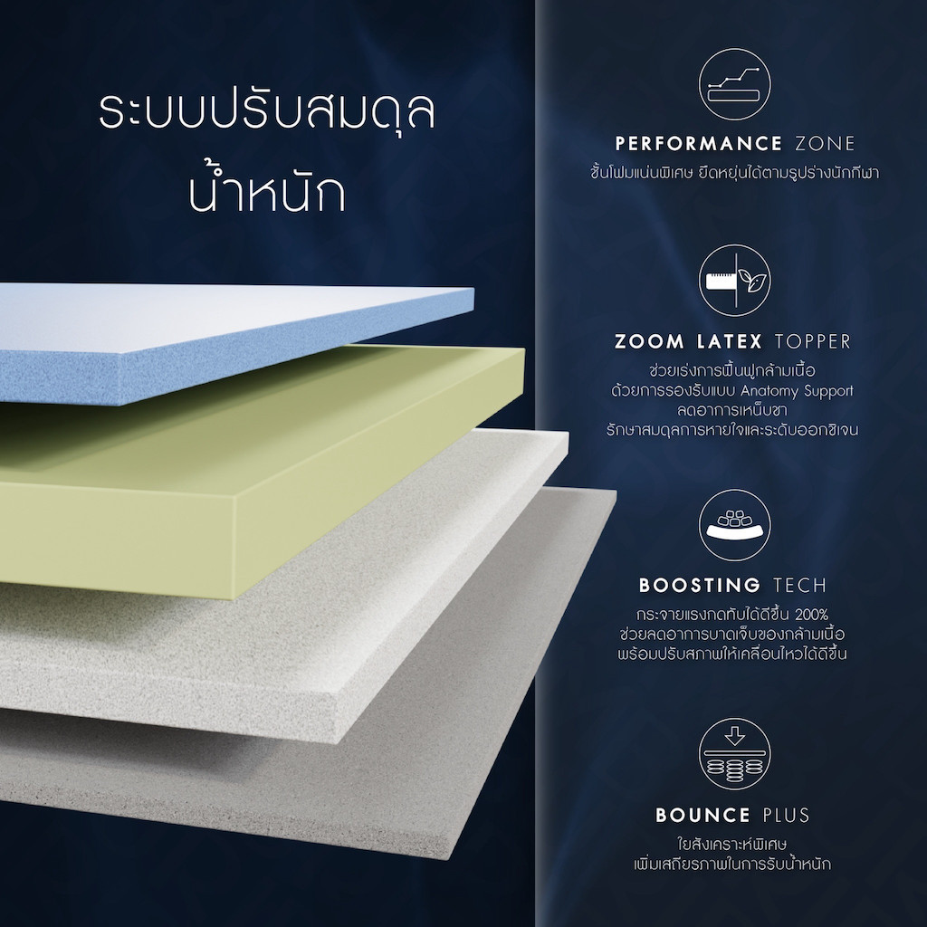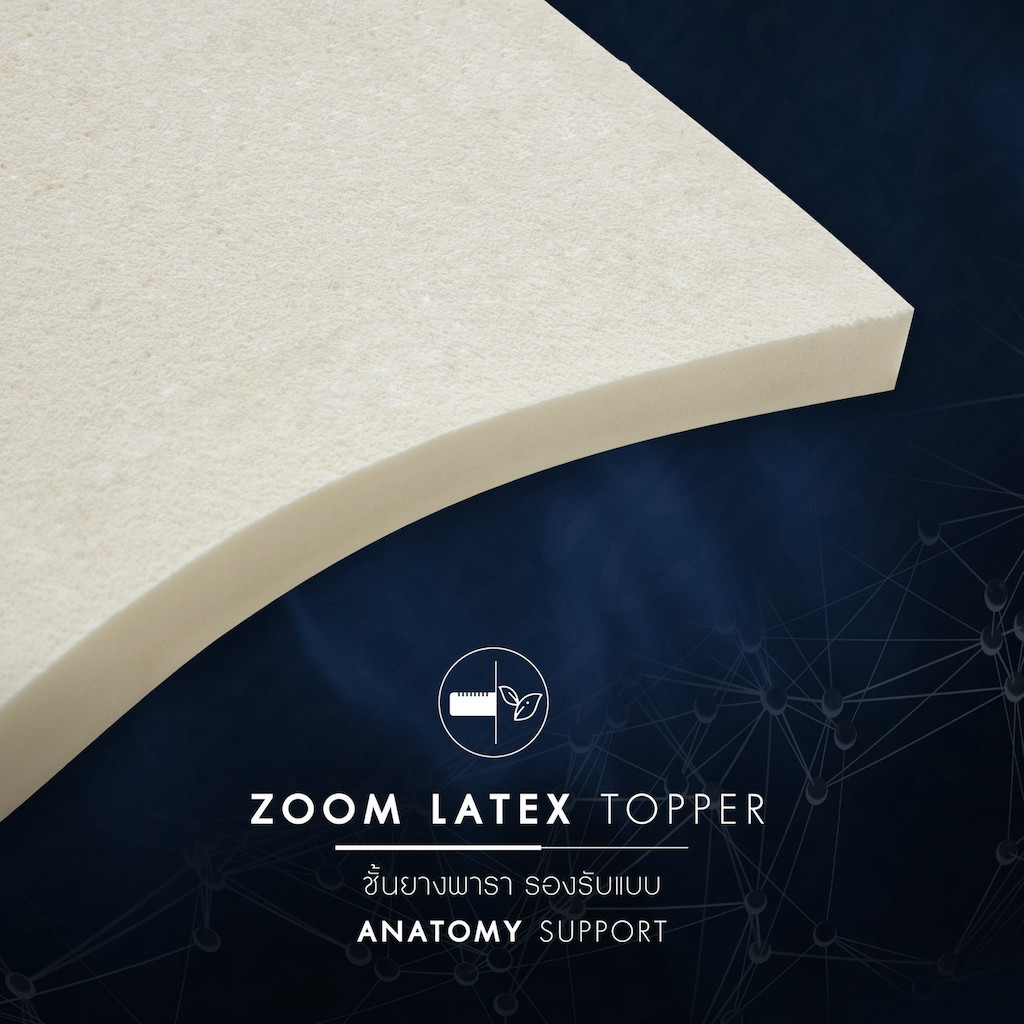 Zoom Latex Topper ชั้นรองรับยางพาราแน่นเป็นพิเศษ ยกระดับการพักผ่อนให้กับนักกีฬา โดดเด่นด้านการโอบอุ้มส่วนเว้าโค้งของสรีระแบบ Anatomy Support ช่วยเสริมระบบไหลเวียนของโลหิตในร่างกายเพื่อกระตุ้นการผ่อนคลายกล้ามเนื้อที่ผ่านการใช้งานอย่างหนัก พร้อมซ่อมแซมและฟื้นฟูได้ดีกว่า