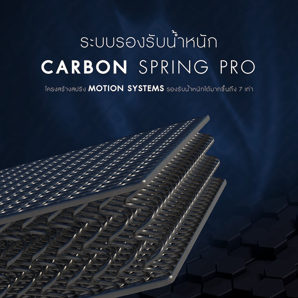 Carbon Spring Pro ระบบสปริงที่ออกแบบเพื่อรองรับมวลกล้ามเนื้อของนักกีฬาโดยเฉพาะ รองรับน้ำหนักได้มากกว่า โดยโครงสร้างสปริงถูกบรรจงจัดเรียงเป็นแนวขนานในองศาต่างๆ สามารถโอบอุ้มสรีระได้อย่างถูกต้องตามวิทยาศาสตร์การกีฬา มอบความยืดหยุ่นและกระจายน้ำหนักได้อย่างสมบูรณ์แบบ ลิขสิทธิ์เฉพาะจากประเทศอังกฤษ