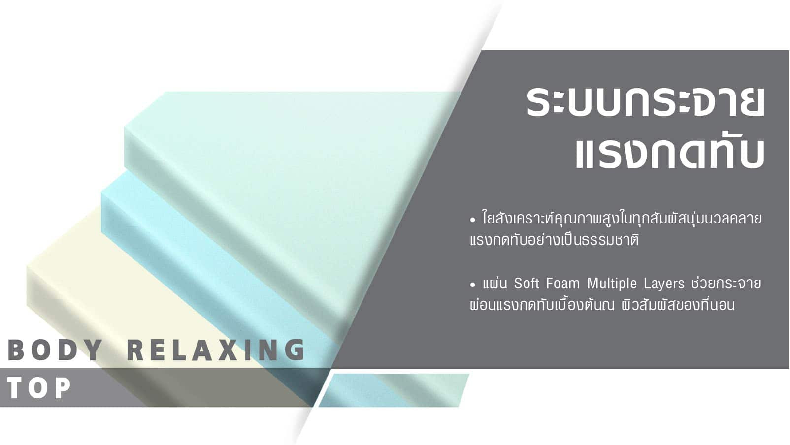• แผ่น Soft Foam Multiple Layers ช่วยกระจายผ่อนแรงกดทับเบื้องต้น ณ ผิวสัมผัสของที่นอน