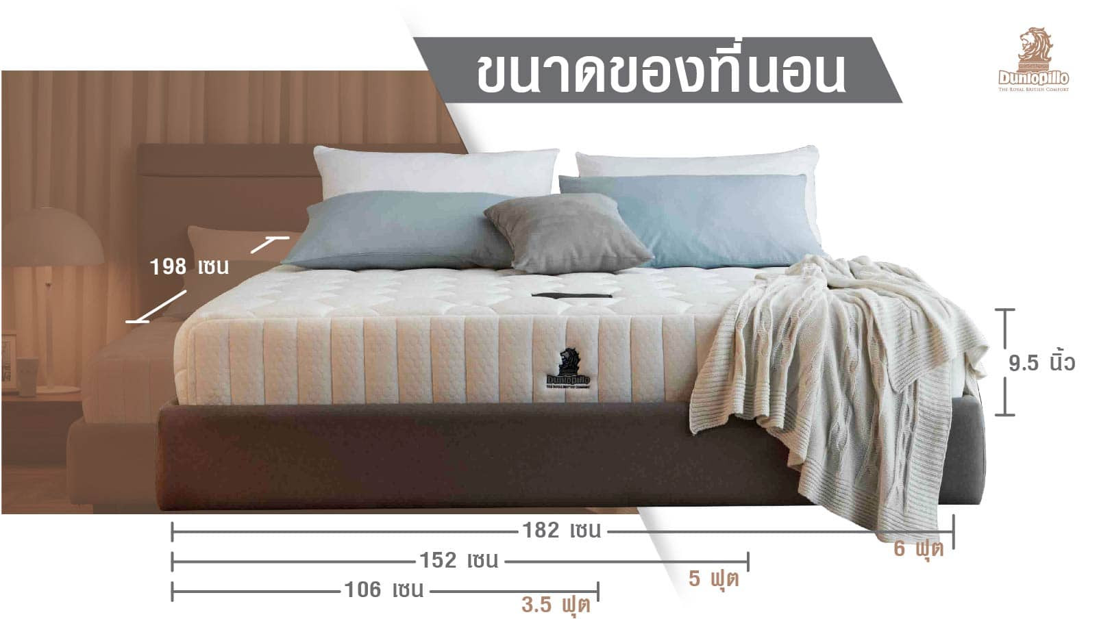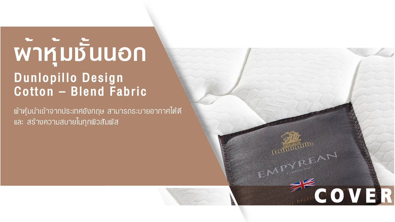 • ผ้าหุ้ม Dunlopillo Design Cotton – Blend Fabric นำเข้าจากประเทศอังกฤษ สามารถระบายอากาศได้ดี และสร้างความสบายในทุกผิวสัมผัส