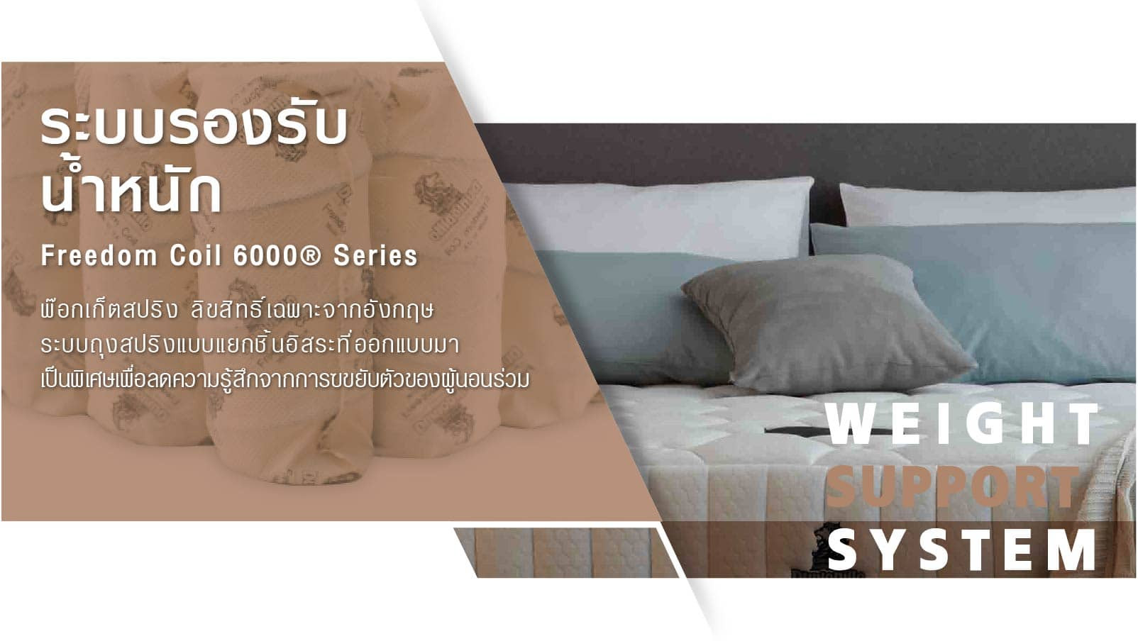 • พ๊อกเก็ตสปริง Freedom Coil 6000 Series ®  ลิขสิทธิ์เฉพาะจากประเทศอังกฤษ ที่เป็นพ๊อกเก็ตสปริงคุณภาพเยี่ยมระบบถุงสปริงแบบแยกชิ้นอิสระ ที่ออกแบบมาเป็นพิเศษเพื่อลดความรู้สึกจากการขยับตัวของผู้นอน สร้างความผ่อนคลายในการพักผ่อน ช่วยให้คุณและคนที่คุณรักหลับสนิทตลอดทั้งคืน