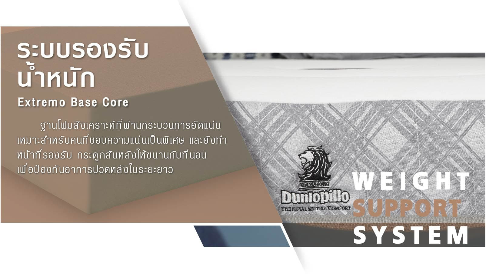• Extremo Base Core ฐานโฟมสังเคราะห์ที่ผ่านกระบวนการอัดแน่น เหมาะสำหรับคนที่ชอบความแน่นเป็นพิเศษ และยังทำหน้าที่รองรับ กระดูกสันหลังให้ขนานกับที่นอน เพื่อป้องกันอาการปวดหลังในระยะยาว