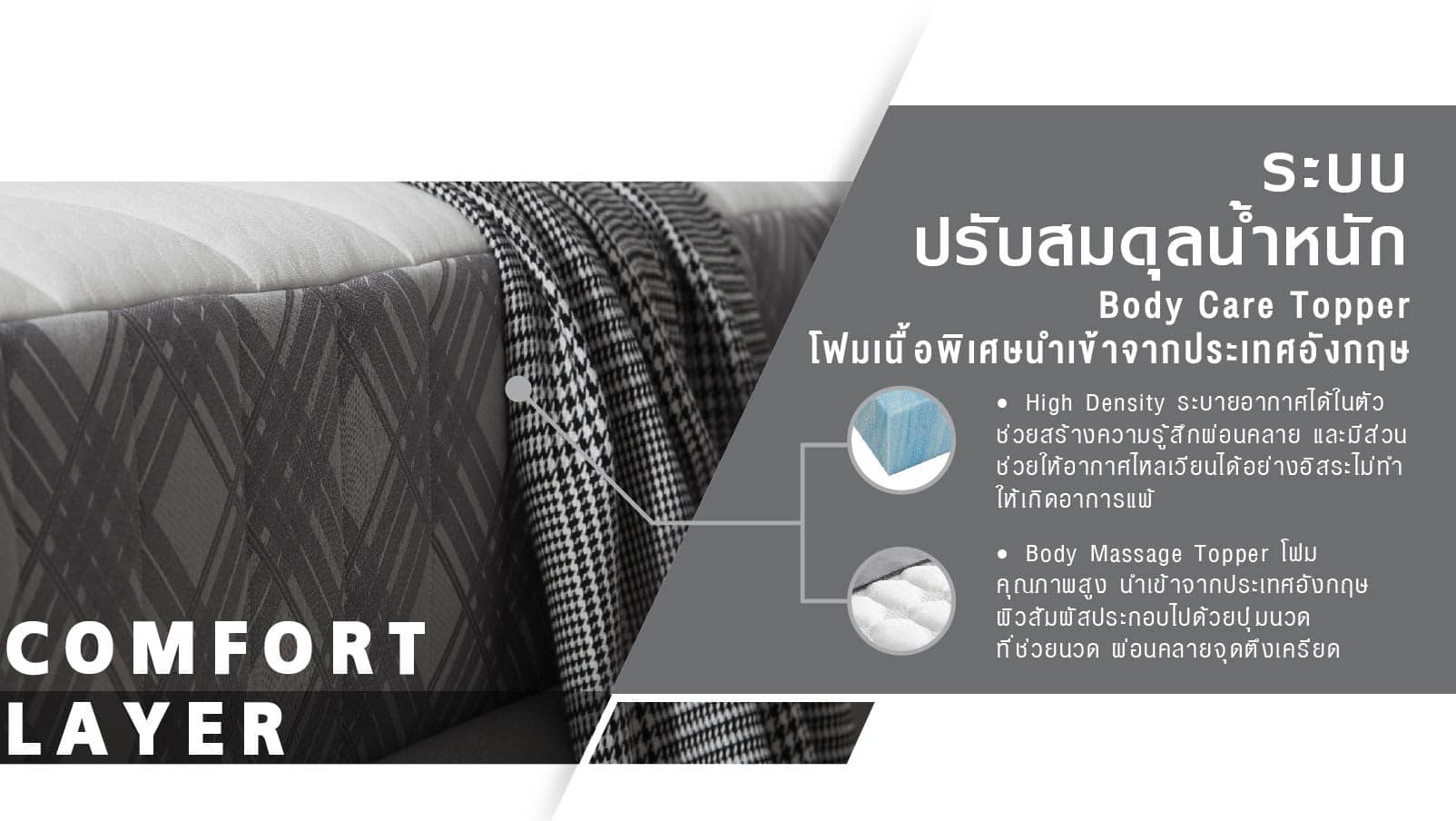 • Body Care Topper โฟมเนื้อพิเศษนำเข้าจากประเทศอังกฤษ High Density ระบายอากาศได้ในตัว ช่วยสร้างความรู้สึกผ่อนคลาย และมีส่วนช่วยให้อากาศไหลเวียนได้อย่างอิสระไม่ทำให้เกิดอาการแพ้เหมาะสำหรับบุคคลที่เป็นโรคภูมิแพ้