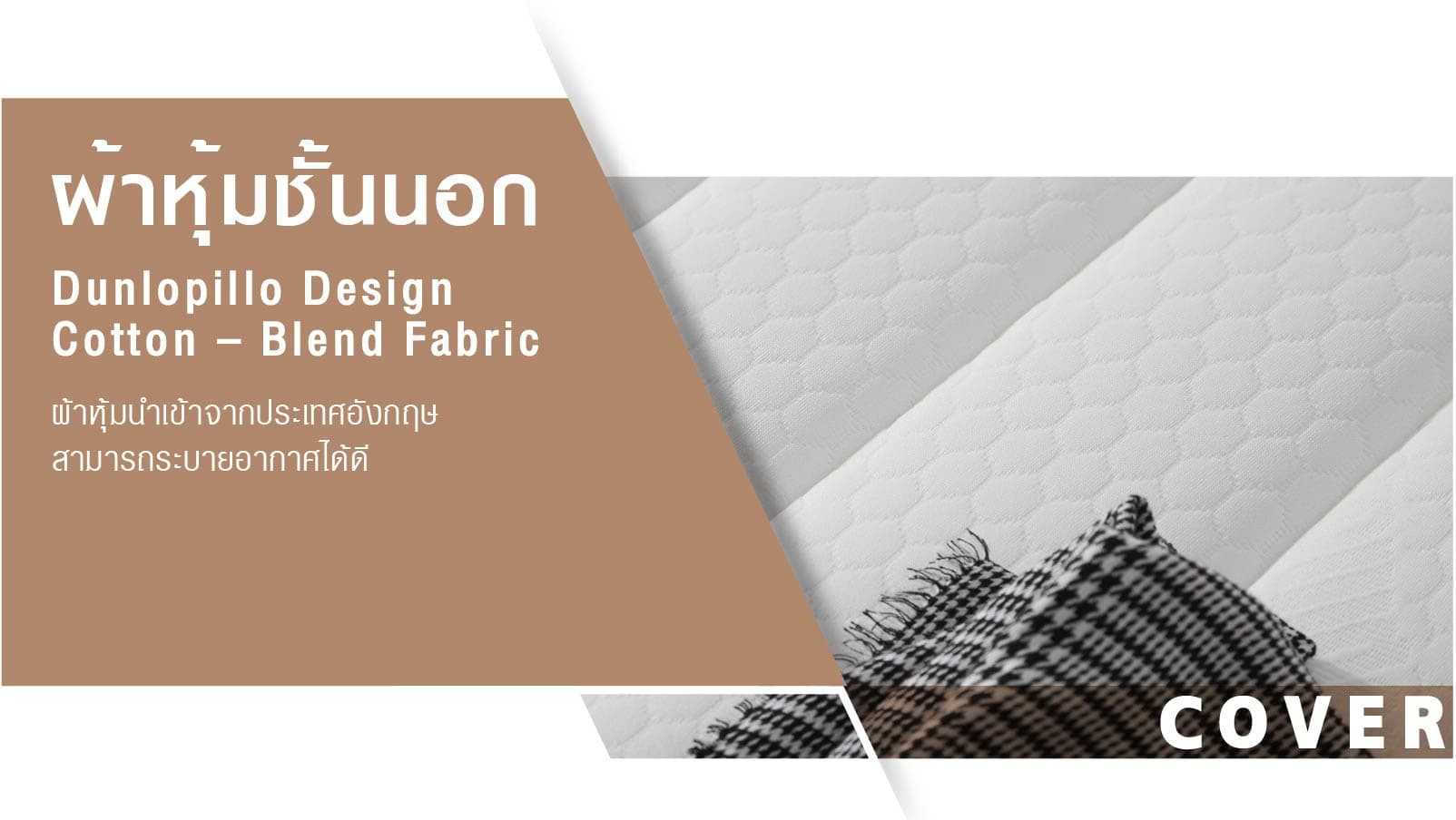 • ผ้าหุ้ม Dunlopillo Design Cotton – Blend Fabric นำเข้าจากประเทศอังกฤษ สามารถระบายอากาศได้ดี  และสร้างความสบายในทุกผิวสัมผัส