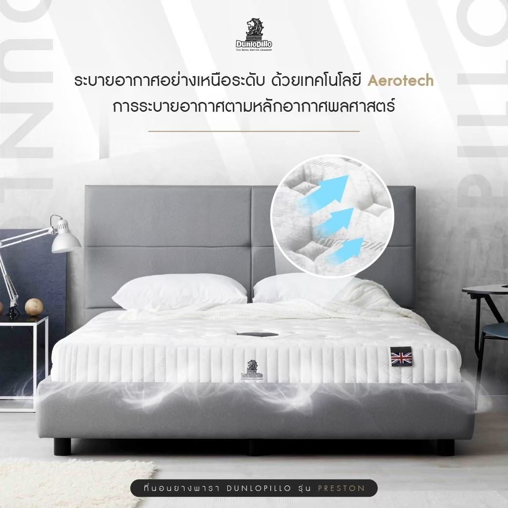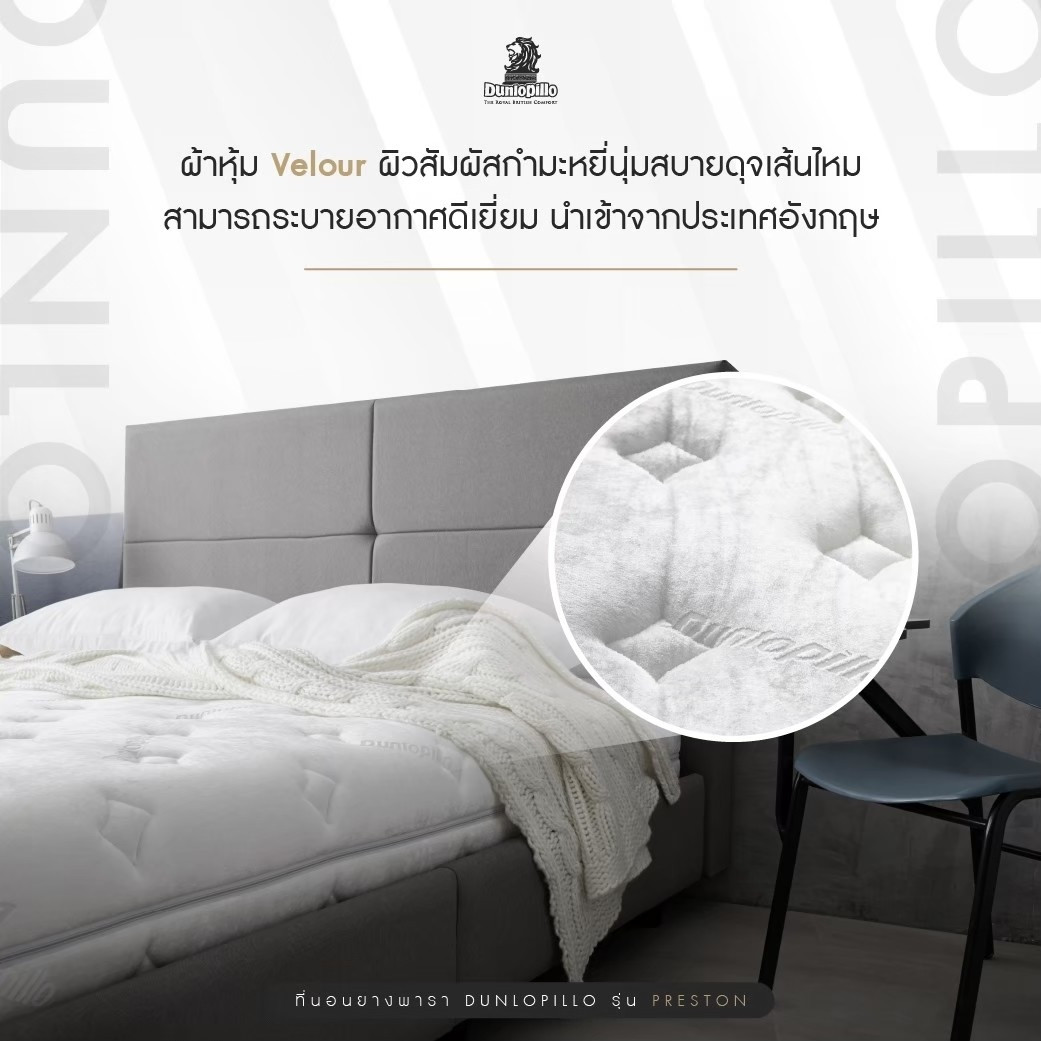 - ผ้าหุ้ม Dunlopillo Design Cotton – Velour Fabric นำเข้าจากประเทศอังกฤษ ผิวสัมผัสกำมะหยี่นุ่มสบายดุจเส้นไหม สามารถระบายอากาศได้ดี และ สร้างความสบายในทุกผิวสัมผัส