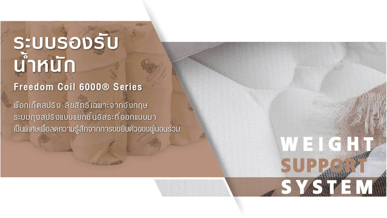 - พ๊อกเก็ตสปริง Freedom Coil 6000® Seriesลิขสิทธิ์เฉพาะจากอังกฤษ ที่เป็นพ๊อกเก็ตสปริงคุณภาพเยี่ยม ระบบถุงสปริงแบบแยกชิ้นอิสระ ที่ออกแบบมาเป็นพิเศษเพื่อลดความรู้สึกจากการขยับตัวของผู้ที่นอนร่วม สร้างความผ่อนคลายในการพักผ่อน ช่วยให้คุณและคนที่คุณรักหลับสนิทตลอดทั้งคืน