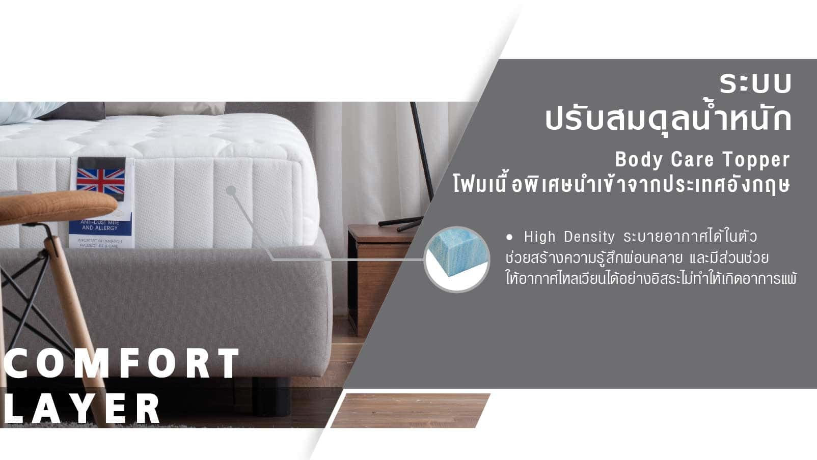 - Body Care Topper โฟมเนื้อพิเศษนำเข้าจากประเทศอังกฤษ High Density ระบายอากาศได้ในตัว ช่วยสร้างความรู้สึกผ่อนคลาย และมีส่วนช่วยให้อากาศไหลเวียนได้อย่างอิสระไม่ทำให้เกิดอาการแพ้เหมาะสำหรับบุคคลที่เป็นโรคภูมิแพ้
