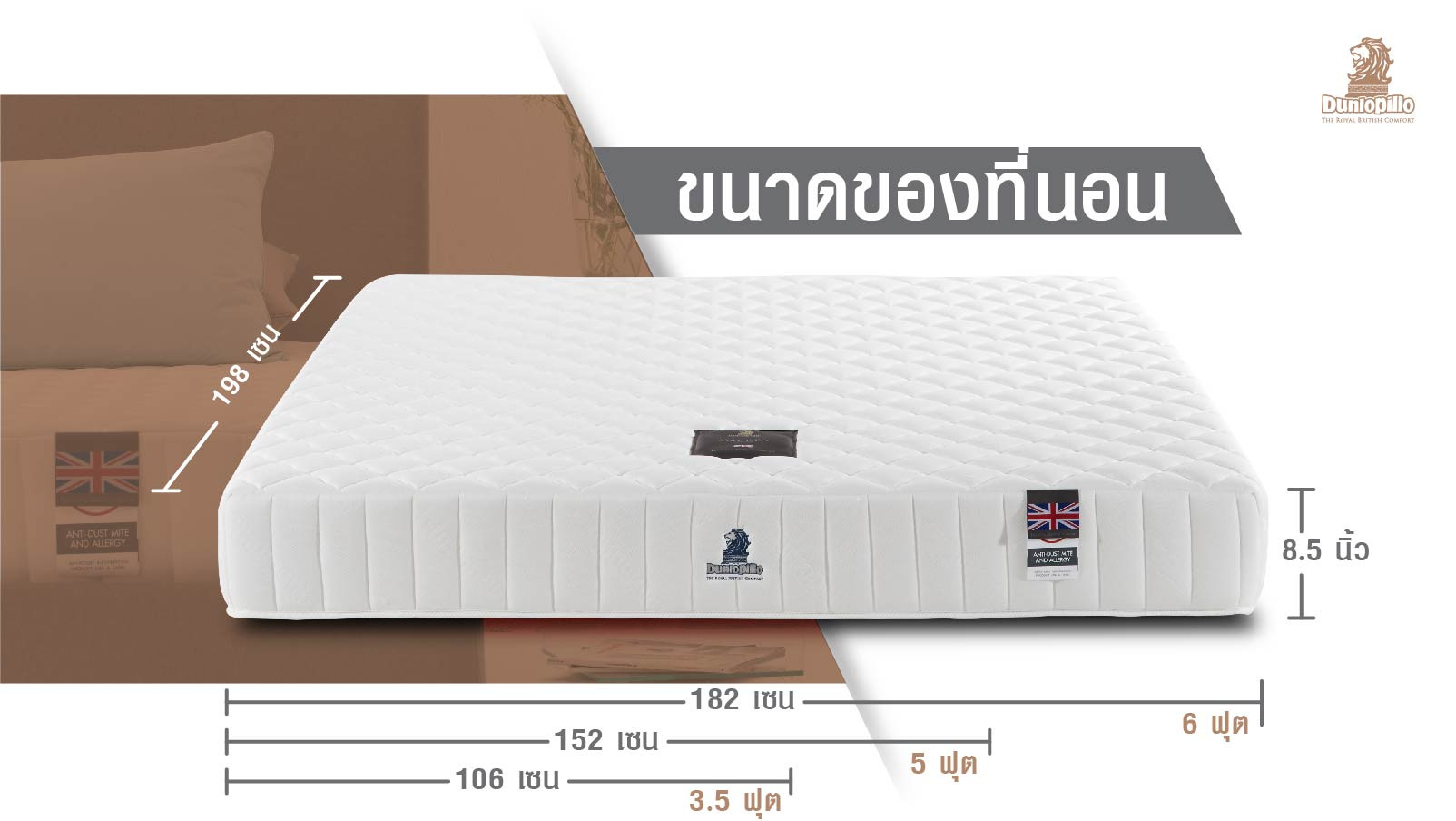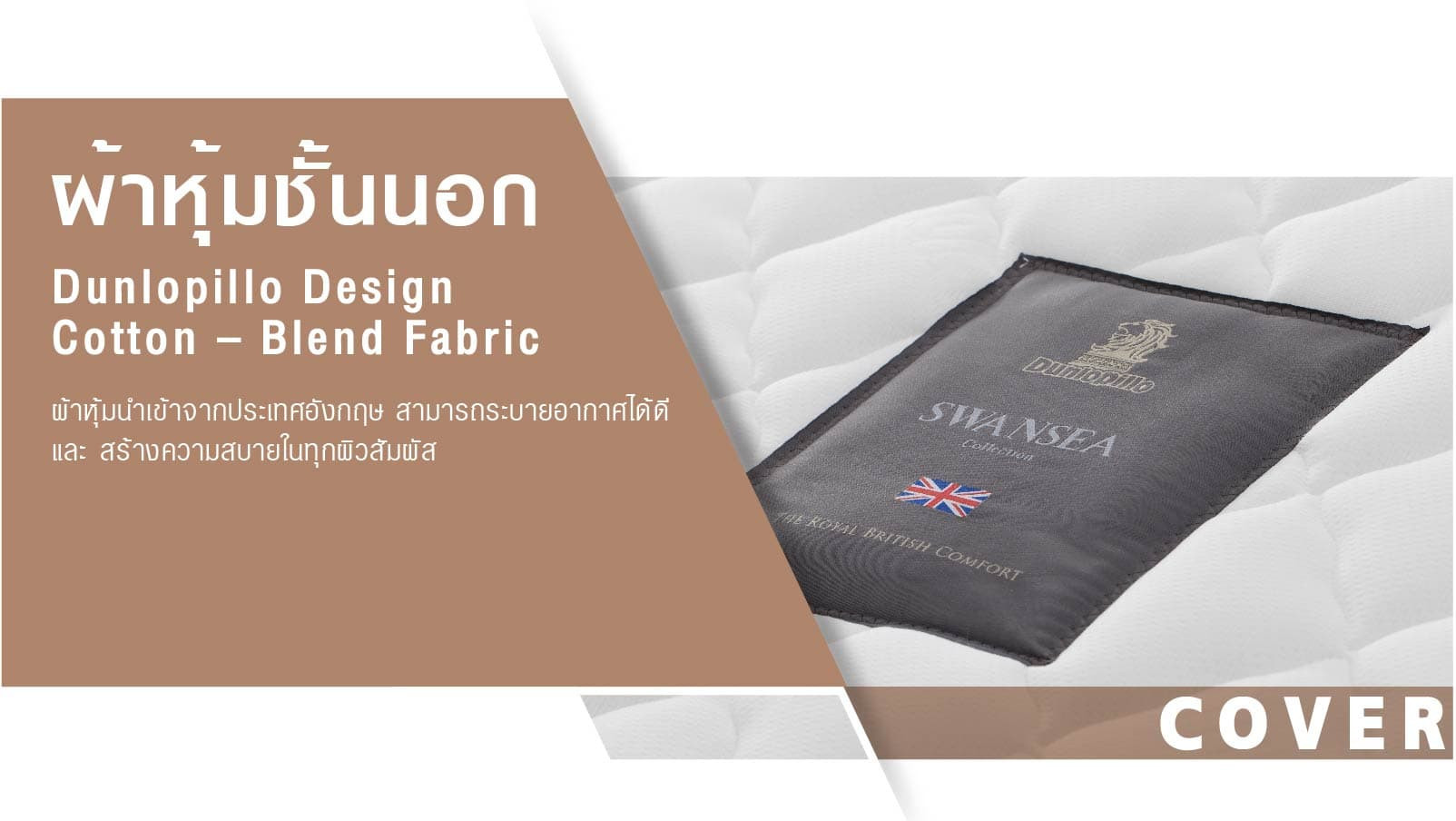 • ผ้าหุ้ม Dunlopillo Design Cotton-Blend Fabric นำเข้าจากประเทศอังกฤษ สามารถระบายอากาศได้ดี และสร้างความสบายในทุกผิวสัมผัส