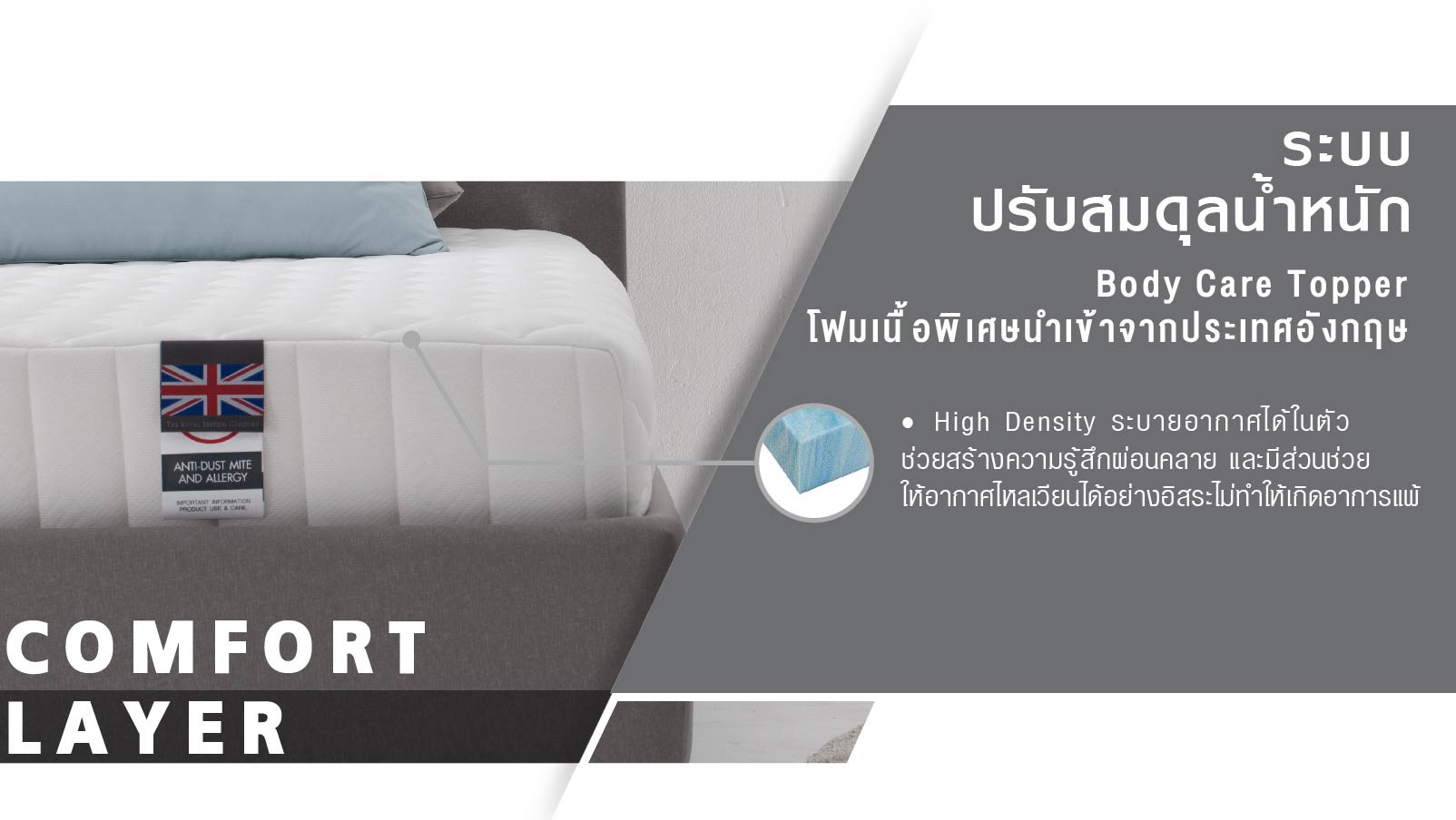 • Body Care Topper โฟมเนื้อพิเศษนำเข้าจากประเทศอังกฤษ High Density ระบายอากาศได้ในตัว ช่วยสร้างความรู้สึกผ่อนคลาย และมีส่วนช่วยให้อากาศไหลเวียนได้อย่างอิสระไม่ทำให้เกิดอาการแพ้เหมาะสำหรับบุคคลที่เป็นโรคภูมิแพ้