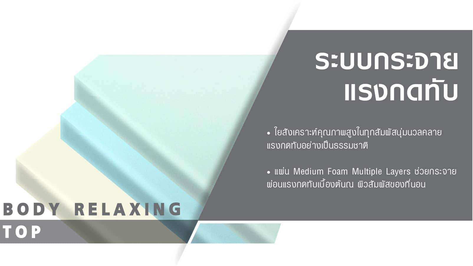 • แผ่น Medium Foam Multiple Layers ช่วยกระจายผ่อนแรงกดทับเบื้องต้น ณ ผิวสัมผัสของที่นอน