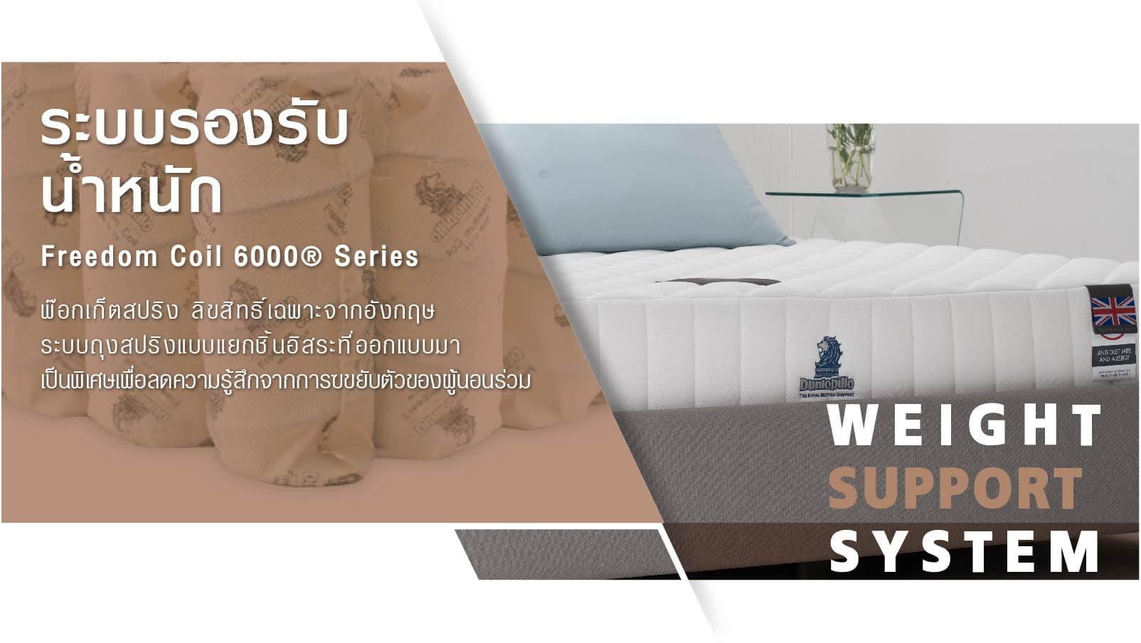 • พ็อกเก็ตสปริง Freedom Coil 6000® Series ลิขสิทธิ์เฉพาะจากอังกฤษ ที่เป็นพ็อกเก็ตสปริงคุณภาพเยี่ยม ระบบถุงสปริงแบบแยกชิ้นอิสระ ที่ออกแบบมาเป็นพิเศษเพื่อลดความรู้สึกจากการขยับตัวของผู้ที่นอนร่วม สร้างความผ่อนคลายในการพักผ่อน ช่วยให้คุณและคนที่คุณรักหลับสนิทตลอดทั้งคืน