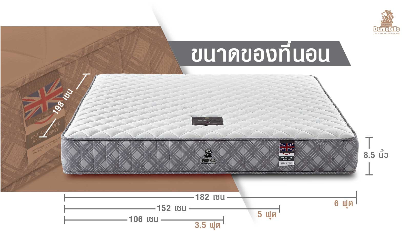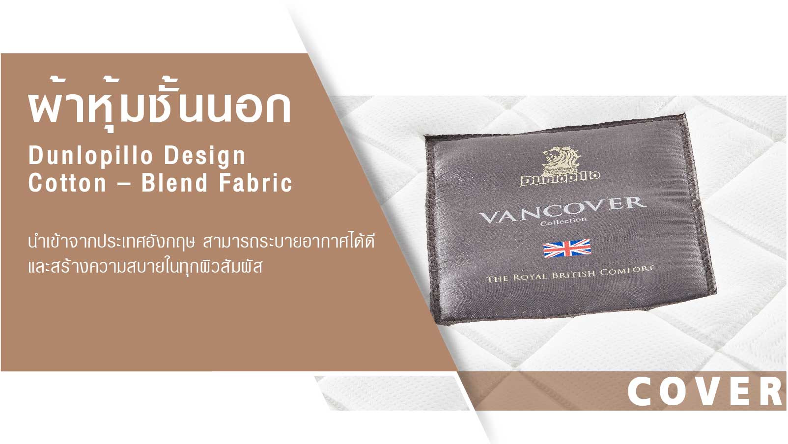 • ผ้าหุ้ม Dunlopillo Design Cotton – Blend Fabric นำเข้าจากประเทศอังกฤษ สามารถระบายอากาศได้ดี และสร้างความสบายในทุกผิวสัมผัส