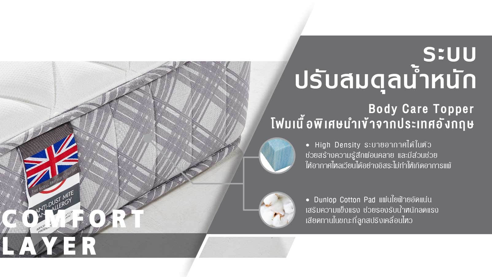 • Body Care Topper โฟมเนื้อพิเศษนำเข้าจากประเทศอังกฤษ High Density ระบายอากาศได้ในตัว ช่วยสร้างความรู้สึกผ่อนคลาย และมีส่วนช่วยให้อากาศไหลเวียนได้อย่างอิสระไม่ทำให้เกิดอาการแพ้เหมาะสำหรับบุคคลที่เป็นโรคภูมิแพ้