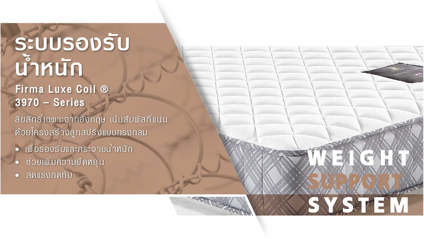 • Firma Luxe Coil ® 3970 – Series ลิขสิทธิ์เฉพาะจากประเทศอังกฤษ ที่ถูกบรรจงจัดเรียงเป็นแนวขนานในองศาต่างๆเพื่อรองรับและกระจายน้ำหนักได้อย่างสมบูรณ์แบบ พร้อมมอบความยืดหยุ่น และลดแรงกดทับ ได้อย่างมีประสิทธิภาพ เน้นสัมผัสที่แน่นด้วยโครงสร้างลูกสปริงแบบทรงกลม